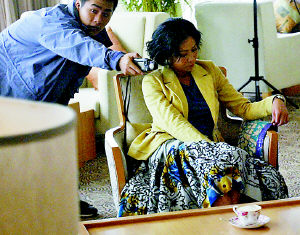 中午時(shí)分,劉嘉玲在其工作人員的陪同下出現(xiàn)在拍攝現(xiàn)場。她身著一件黑底白紋連衣裙,外面還套著一件帶有荷葉邊的黃綠色小短裝。從進(jìn)入現(xiàn)場到攝影師開拍前,嘉玲一直面無表情,雖然她時(shí)不時(shí)瞪瞪自己的大眼睛,似乎想讓自己看來更精神些,但在拍攝的過程中,她僵硬的表情,卻讓她無法掩飾內(nèi)心的倦怠。