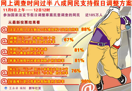 ???????新華網(wǎng)武漢11月13日電(記者沈翀)國(guó)家法定節(jié)假日調(diào)整草案網(wǎng)上調(diào)查時(shí)間過(guò)半,綜合調(diào)查支持率在八成以上。但調(diào)整“五一”長(zhǎng)假與5個(gè)小長(zhǎng)假方案的支持率卻只有67%和76%,仍有不少人支持保留“五一”長(zhǎng)假。這在某種程度上反映出,老百姓對(duì)5日國(guó)務(wù)院法制辦發(fā)布的《職工帶薪年休假規(guī)定(草案)(征求意見(jiàn)稿)》能否落到實(shí)處,仍存有普遍疑慮。