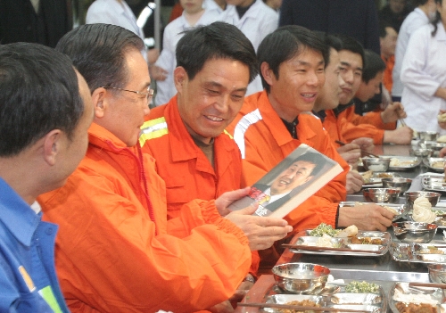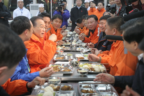 ????已是傍晚七時(shí),溫家寶穿著橘黃色工作服來到職工餐廳,和節(jié)日值守的職工們共進(jìn)晚餐。他和當(dāng)代工人的杰出代表許振超等職工邊吃邊聊,鼓勵大家面對當(dāng)前的經(jīng)濟(jì)困難,要團(tuán)結(jié)一致,同舟共濟(jì),眾志成城,共渡難關(guān)。