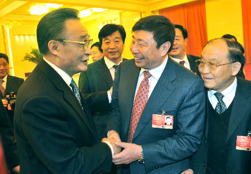 ??? 2009年3月7日,兩會期間,吳邦國委員長參加山東代表團審議。對青島港的生產(chǎn)非常關(guān)心,對青島港集裝箱去年實現(xiàn)1000萬標準箱大跨越表示充分肯定。吳邦國委員長(左)親切接見集團董事局主席、總裁常德傳。