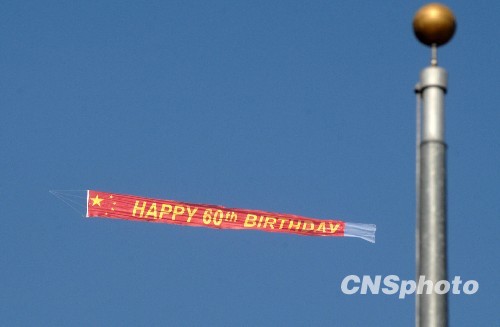 ????為了營造六十周年大慶的喜慶氣氛,主辦方特意租用了一架小型飛機,飛機拖著繪有“五星紅旗”圖案和“六十歲生日快樂”字樣的巨型橫幅在空中穿梭盤旋,引得現(xiàn)場民眾翹首觀看。