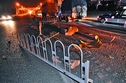 ????10月17日夜里10時(shí)45分,25米長(zhǎng)的藍(lán)色解放運(yùn)輸車在海爾立交橋北向南下橋處急轉(zhuǎn)彎,后面駛來的紅色重汽自卸車剎不住車撞了上去,兩車堵了黑龍江路5個(gè)車道,就在交警設(shè)法拖動(dòng)運(yùn)輸車離開現(xiàn)場(chǎng)時(shí),一輛綠色拖掛車剎車失靈沖進(jìn)現(xiàn)場(chǎng),為躲避圍觀人群與兩車二次沖撞,幸未造成人員傷亡。直到第二天中午11時(shí)30分,事故車輛被全部拖離現(xiàn)場(chǎng),車禍造成千余輛車通行受阻。