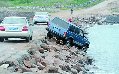 ????“現(xiàn)在海水已經(jīng)退潮了,我這輛吉普車才從水里露了出來,剛才海水幾乎跟大壩持平,風(fēng)浪特別大,根本沒法營救?!庇浾咴诂F(xiàn)場(chǎng)找到了吉普車司機(jī)楊師傅,他告訴記者,幸好當(dāng)時(shí)他車速不快,沖下大壩時(shí),前后車輪分別被大石塊擋住,他坐在車?yán)锖荛L(zhǎng)時(shí)間沒敢動(dòng),生怕車輛失去平衡再次滾落。“當(dāng)時(shí)吉普車被大浪拍打得不停地?fù)u晃,我趁著海浪比較平靜時(shí)打開車門跳了出來。”楊師傅說,他已聯(lián)系保險(xiǎn)公司前來理賠。