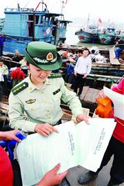 5月31日,青島沙子口邊防派出所警官劉婕向漁民發(fā)放伏季休漁通知。