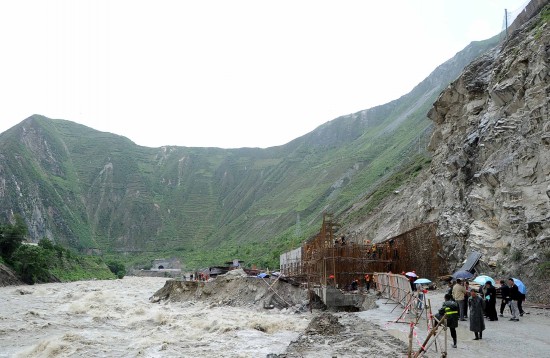 ????6月8日,四川茂縣南新鎮(zhèn)境內(nèi)寬30米、長(zhǎng)100米的保通便道被沖毀后,國(guó)道213線完全中斷。新華社記者 陳凱攝 ????連日強(qiáng)降雨致使四川阿壩州茂縣岷江河水位不斷上漲,7號(hào)晚上,213國(guó)道茂縣段一段路基被洪水沖毀,這一路段徹底中斷,這已經(jīng)是這條有著“震中生命線”之稱的國(guó)道,在近期內(nèi)的第二次中斷。 ????受上游強(qiáng)降雨影響,7號(hào)深夜23多,國(guó)道213線茂縣南新鎮(zhèn)段公路被洪水沖毀約100米,道路中斷,一名正在駕駛摩托車的人員失蹤。事故發(fā)生后,當(dāng)?shù)卣⒓窗才湃藛T搶險(xiǎn)救人,轉(zhuǎn)移周邊學(xué)校師生。目前,國(guó)道213線茂縣段已實(shí)施緊急管制,車輛和人員均被限行。 ????2010年6月8日早晨,國(guó)道213線汶川老虎嘴路段也出現(xiàn)三處坍塌路面,其中較大的一塊約70米,深約10米。由于三分之二寬的路面已經(jīng)不能通行,交通出現(xiàn)了擁堵,交警部門(mén)正在全力疏導(dǎo),路政部門(mén)也在加緊搶修道路。 |