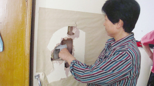 ????記者看到304室北面小屋的門,有一部分用牛皮紙貼上,輕輕撕開紙,赫然出現(xiàn)一個大洞。她說這是有天早晨喊女兒起床時敲通的。一個年過半百的女子,竟然敲門時就輕易地把門敲通,可見這門板的質(zhì)量。果然,記者很輕易就掰下一塊面板,這種復(fù)合木板的厚度不到3毫米,難怪經(jīng)不起“敲”。