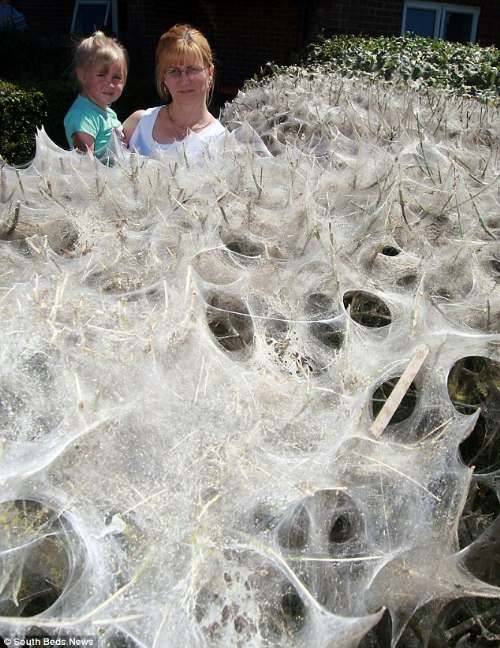 英國婦人茱莉抱著女兒,看到自家花園灌木被厚厚的網(wǎng)覆蓋,覺得驚訝又無奈。 ????中新網(wǎng)6月9日電 據(jù)臺灣“今日新聞網(wǎng)”8日報道,這不是恐怖片的場景,卻有恐怖片的效果──英國最近出現(xiàn)數(shù)以萬計的“蠕蟲”編織又黏又厚的怪異蟲網(wǎng),它們多半出現(xiàn)在灌木叢、路標下和民宅花園的籬笆,研究人員指出,這些怪網(wǎng)是巢蛾為(ermine yponomeuta moths)化蛹而準備。 ????蠕蟲通常把網(wǎng)織在喜愛的食物周邊,例如櫻桃樹、山楂等,然后在網(wǎng)巢里吃掉樹葉,還能保護蟲子遭受鳥和黃蜂的侵襲,直到它們變成蛾。昆蟲專家斯Stuart Hine指出,其實這種網(wǎng)在英國很常見,通常它們每年7、8月織網(wǎng),一年只這么一次。 |