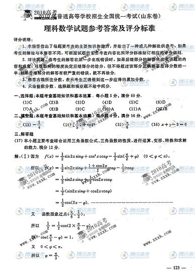 2010年高考數(shù)學(xué)試題答案公布(山東卷)