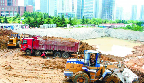 ????施工人員正在往大坑里填土。