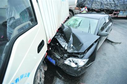 ????記者看到車(chē)禍現(xiàn)場(chǎng)西側(cè)是一片工地,路口交通信號(hào)燈一直黃燈閃爍示警,不時(shí)有車(chē)輛從工地方向駛出,從馬路中間隔離墩豁口橫過(guò)馬路。一輛白色的廂式貨車(chē)就橫在馬路中間的隔離墩豁口處,車(chē)身左側(cè)的油箱被撞破,一輛黑色比亞迪轎車(chē)車(chē)頭頂在廂式貨車(chē)車(chē)身中部,車(chē)前蓋蹺起,車(chē)頭被撞凹陷,駕駛室內(nèi)仍然能看到斑斑血跡,車(chē)內(nèi)傷者已經(jīng)被120救護(hù)車(chē)緊急送往海慈醫(yī)院急救。交警隨后趕到現(xiàn)場(chǎng),將兩輛肇事車(chē)拖走。