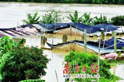 惠來縣邦山村有的地方水深達到兩三米,被困人員已被轉移安置,剩下一些豬只爬上屋頂避災(南方日報記者 梁文祥 攝)