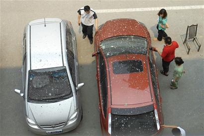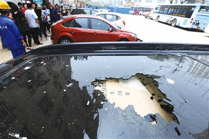 ????記者在現(xiàn)場(chǎng)看到,停在鄆城北路西側(cè)的一排汽車上都散落著水泥點(diǎn)子,其中一名越野車的女車主正心疼地擦拭著車身,她告訴記者,半空中掉落的石子砸壞了越野車的后車燈,還把天窗砸了個(gè)大窟窿?!拔屹I這車花了14萬元,剛開了兩個(gè)半月,有3塊車玻璃被砸碎,車頂也被砸得凹陷,就是修好了也變成舊車了?!痹揭败嚺赃叺募t色福特轎車司機(jī)郁悶地說。