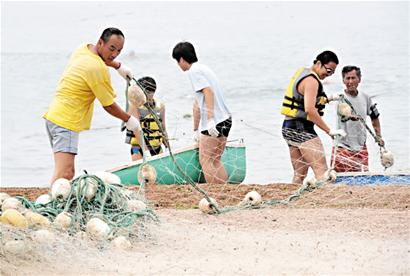 ????記者采訪得知,六浴原定于明天開放,但是因為受到滸苔侵襲影響,只能延遲開放時間;二浴和三浴計劃7月5日開放,目前工作人員都在密切關(guān)注滸苔的動向。這三大浴場最終開放時間待定。 (記者 孫靜芳)第一海水浴場工作人員將防鯊網(wǎng)裝運到船上準備到深海區(qū)域下網(wǎng)施工。 記者 趙健鵬 攝