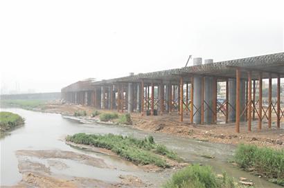 ????記者還注意到,項(xiàng)目部除了澆筑橋面,還有幾輛挖掘機(jī)忙著清理河道上的圍堰,施工人員告訴記者,去年年底項(xiàng)目開(kāi)工后,首先進(jìn)行的是樁基工程,為了減少河道水對(duì)工程的影響,因此在河的北側(cè)建了一段高約兩三米的圍堰?!澳壳耙堰M(jìn)入汛期,尤其是7月底至8月中旬,雨量將達(dá)到全年最大,為了增強(qiáng)河道的泄洪能力,我們根據(jù)防汛辦的要求,把圍堰鏟掉,恢復(fù)河道。此外,由于大橋接線工程已基本進(jìn)入上部結(jié)構(gòu)施工,鏟掉圍堰對(duì)工程影響不大。”施工人員介紹。 (記者 孫靜芳 攝影報(bào)道)