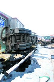 ????“我們和西面的飯店、汽修廠(chǎng)、洗車(chē)店、還有一處正在施工的二層建筑都被迫停業(yè)或停工了,受了很大的影響和損失。”李先生告訴記者,他們被黑乎乎的原油堵在網(wǎng)點(diǎn)里,一天都沒(méi)正常工作。“可氣的是,到現(xiàn)在車(chē)主都沒(méi)有出面,我們也不會(huì)處理這些原油,只能用沙子覆蓋在原油表面。”李先生說(shuō),他們已將油罐車(chē)暫時(shí)扣留,等車(chē)主露面后做進(jìn)一步處理。