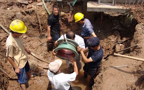 ????晚上11時,就在大家逐漸進入夢鄉(xiāng)準備好好休息一下的時候,福州路管線輔助設(shè)施再次出現(xiàn)故障,供水被迫停止。維修人員接通知后,迅速集結(jié),拖著疲倦的身體再次投入到搶修戰(zhàn)斗中。由于事故點敷土較深,地下又有其它通訊等公共設(shè)施,這給修復(fù)工作帶來了較大困難。但大家知道時間就是企業(yè)的效益,一定要在最短時間內(nèi)完成搶修。關(guān)閘止水,開挖工作坑,配置管件……