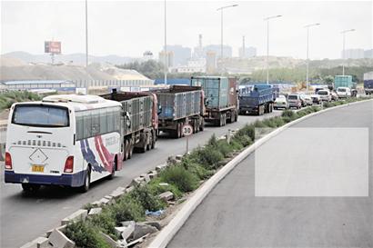 ????昨天中午12時(shí)15分,記者沿環(huán)灣大道返回市區(qū),行至距離新雙埠收費(fèi)站1公里、雙埠立交橋下路段時(shí),此處道路彎彎曲曲,大貨車及大巴車經(jīng)行此處時(shí)均小心翼翼,車速非常緩慢,不一會(huì)便聚集了大量車流。