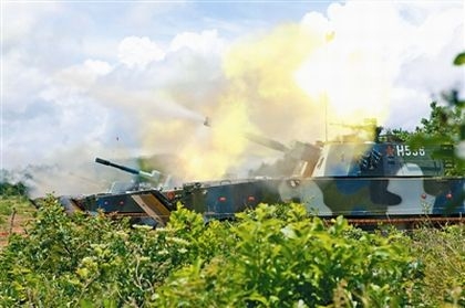 新型兩棲自行火炮齊射。韓來軍 攝