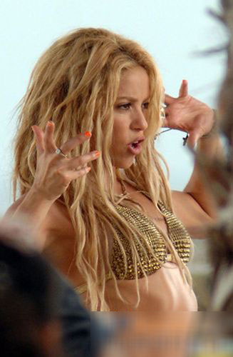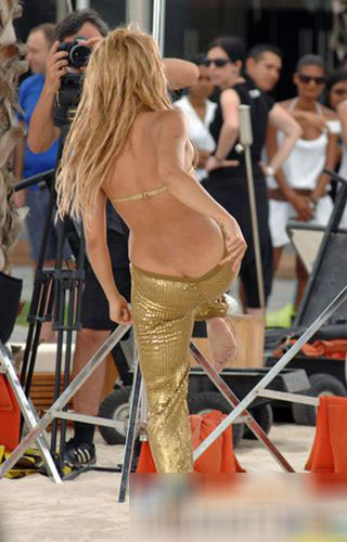 ????出生于哥倫比亞的流行歌手夏奇拉日前穿一件金色文胸加金色長(zhǎng)褲,拍攝她的電影音樂視頻。拍攝時(shí)還臨時(shí)補(bǔ)妝,邊唱邊跳,不知是褲子褲帶太松還是夏奇拉有意為之,褲子差點(diǎn)掉下來。