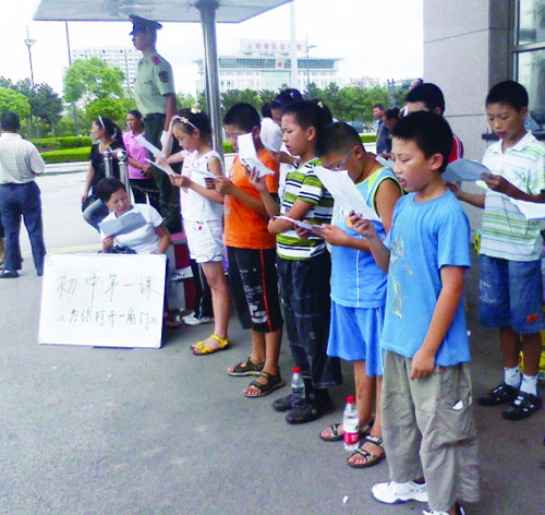 ????9月1日上午7:50,12名應(yīng)該坐在教室里的孩子出現(xiàn)在了鹽城市政府大門外,和他們在一起的,還有幾十名表情嚴(yán)肅的家長。