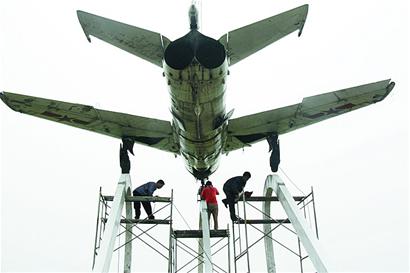 ????昨日上午10時許,經(jīng)過施工人員的努力,兩架殲六飛機(jī)面向東南方“騰空而起”。“這兩架殲六飛機(jī)雕塑考慮到鋼結(jié)構(gòu)、承重以及風(fēng)速等各方面的要求,能抗12級大風(fēng)?!爆F(xiàn)場施工負(fù)責(zé)人告訴記者,殲六飛機(jī)機(jī)身長12米,機(jī)頭前方還有2米長的測速桿,伸展機(jī)翼9米,停放高度3.88米,裝有兩臺WP-6渦噴發(fā)動機(jī),正常起飛重量為7.4噸,拆除部分裝備后的重量也有5噸,因此對設(shè)計及吊裝過程都有很高的要求。