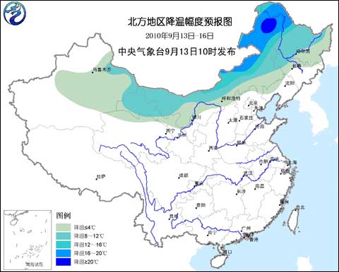 圖1 北方地區(qū)降溫幅度預(yù)報圖(2010年9月13日至16日)