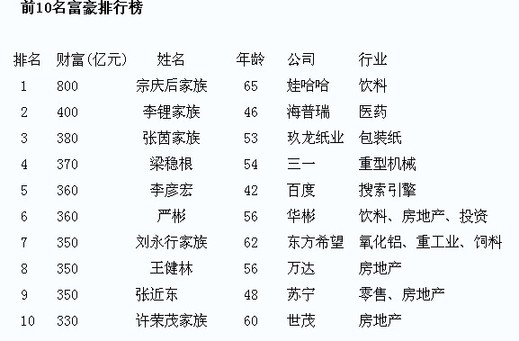????根據(jù)胡潤(rùn)研究院公布的數(shù)字,今年中國(guó)十億富豪的人數(shù)增加到1363名,百億富豪達(dá)到97名。中國(guó)前1000名富豪平均財(cái)富比兩年前增長(zhǎng)了64%,比去年增長(zhǎng)了26%,其中醫(yī)藥、IT、零售和服裝行業(yè)增長(zhǎng)最快。在新上榜的四位富豪中,娃哈哈集團(tuán)董事長(zhǎng)宗慶后以800億元高居榜首,財(cái)富總額比排名第二位的李鋰家族高出整整一倍。