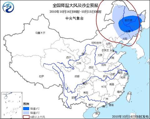 10月14日08時(shí)-10月15日08時(shí),全國(guó)降溫大風(fēng)及沙塵預(yù)報(bào)圖
