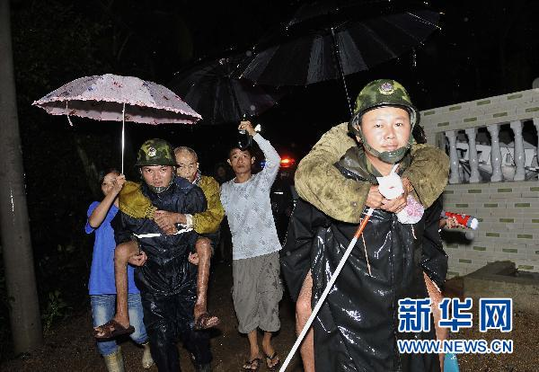 10月16日,海南省萬寧市萬城鎮(zhèn)民兵預備役官兵正在轉(zhuǎn)移萬城鎮(zhèn)仁里村村民。 15日以來,海南又迎來新一輪強降雨,多個市縣再次出現(xiàn)城市內(nèi)澇、村莊群眾被困等災情。海南省萬寧市政府所在地萬城鎮(zhèn)約有1.57萬名群眾受困,目前已緊急轉(zhuǎn)移2600余人。新華社記者 郭程 攝