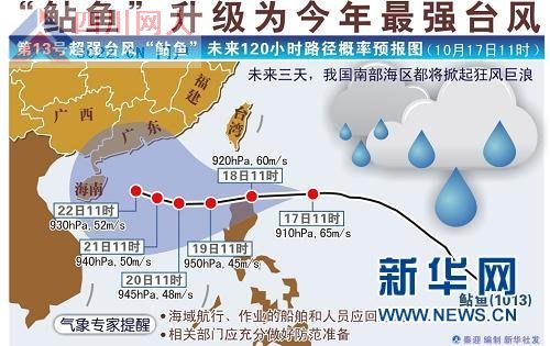 ????中廣網(wǎng)北京10月19日消息 (記者許云)據(jù)中國之聲《新聞縱橫》報道,中央氣象臺最新消息,最大風(fēng)力超過17級,堪稱今年最強的臺風(fēng)——“鲇魚”,今天將進(jìn)入我國南海東部海面,受此影響海南、廣東等我國華南沿海地區(qū)將出現(xiàn)劇烈的風(fēng)雨天氣。