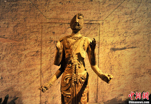 敦煌研究院珍藏的唐代木雕六臂觀音像。