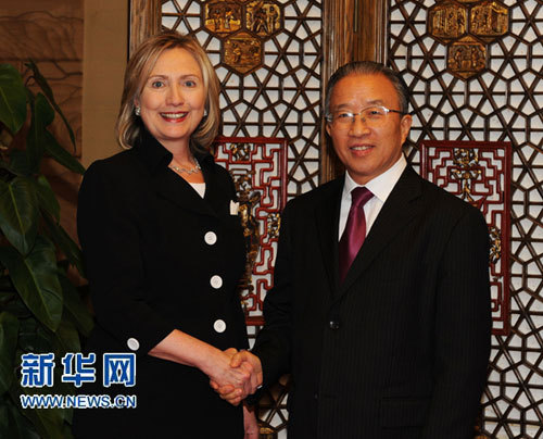 國務(wù)委員戴秉國30日在海南省三亞市與美國國務(wù)卿希拉里·克林頓舉行非正式會晤。新華社發(fā)