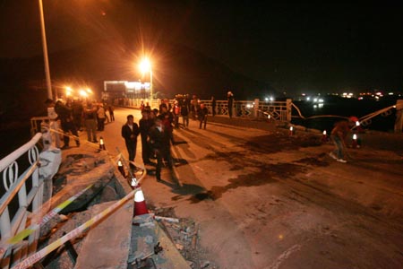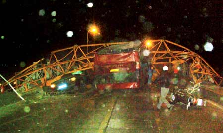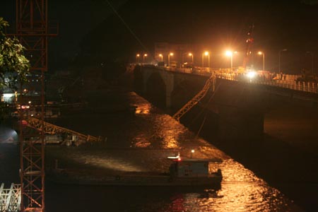 ????在大橋中段東面的兩段長(zhǎng)達(dá)6米的護(hù)欄已經(jīng)被撞塌,只剩下兩根歪曲的鋼管,護(hù)欄下人行道的橋面也被撞塌,橋面露出了鋼筋,形成了一個(gè)6米長(zhǎng)、半米寬的缺口。同樣在西面的一段3米長(zhǎng)的護(hù)欄也被撞斷,護(hù)欄下的人行道橋面也形成了1米長(zhǎng)、半米寬的缺口。在大橋東面的3號(hào)墩處,一段塔吊傾斜躺在了橋墩上。