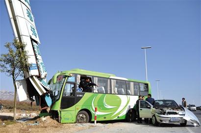 ????昨天中午11時30分,記者趕到現(xiàn)場看到,一輛車號為魯B86257的綠色大客車停在路邊,車頭頂在一塊高七八米的大型廣告牌上,已經(jīng)嚴重撞扁,前擋風玻璃被撞碎,廣告牌底部也被頂?shù)弥щx破碎,牌身向西北方向傾斜;一輛銀白色小轎車停在一側,車頭也被撞爛。
