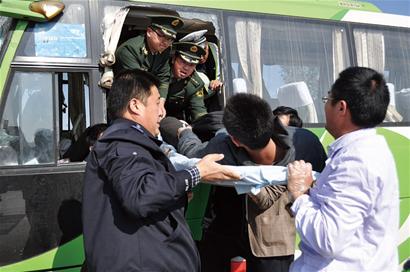 ????記者看到,客車上的大部分受傷乘客都已經(jīng)被救出送往醫(yī)院,幾名邊防民警將一名腿部受傷的男乘客抬到擔架上,順著客車左側的一個車窗將擔架推出,早已等候在下面的民警和醫(yī)護人員趕緊上前接過擔架,將這名男乘客抬到救護車上,送往膠南市開發(fā)區(qū)醫(yī)院救治。