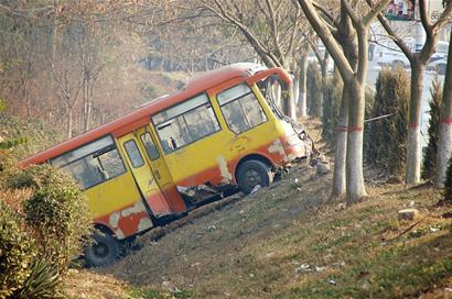 ????昨天上午,記者聞?dòng)嵹s到車禍現(xiàn)場(chǎng)看到,一輛中巴客車頭朝上橫在路溝里,車頭已經(jīng)完全變形,車身經(jīng)過猛烈撞擊也多處受損。而與客車相撞的那輛大貨車則停在離現(xiàn)場(chǎng)50多米的路段,馬路上撒滿了水泥,為了勘查現(xiàn)場(chǎng),幾名民警正將撒落在路面上的水泥清理干凈。