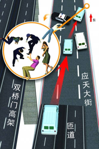 ????晚10點(diǎn)45分,記者趕到事發(fā)現(xiàn)場,這里離雙橋門高架橋大明路下橋口約100多米。此時(shí),現(xiàn)場警燈閃爍,交警在勘察現(xiàn)場。附近居民王師傅告訴記者,被撞飛的分別是一對(duì)正在吵架的中年夫妻和三名接到報(bào)警趕到這里來調(diào)解的民警,三名民警中還有一名是女警,其中一名頭部傷得很重的民警是被面包車撞飛好幾米遠(yuǎn),砸中慢車道上一名圍觀的修理工。