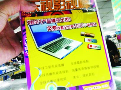 ????“老板,有萬能電視棒嗎? ”昨日14時許,記者來到遼寧路電子信息城負一層找到一個出售各類電子配件的柜臺。店主立即表示有這種產(chǎn)品,但沒現(xiàn)貨需要訂購。 “這可是三無違禁產(chǎn)品,你要的話,我可以給你拿一個先看看。 ”兩分鐘后,該店主將一個包裝盒拿給記者,盒上寫著“紫光.登月者電視棒”,盒內(nèi)裝著一個“U盤”,能接收全球5000個電視臺。 “這種電視棒是最近才出現(xiàn)的新產(chǎn)品,不是每家都能拿到貨,我這賣128元一個,買的人很多,前幾天賣完后就斷貨了,要從別的店里借。 ”該店主介紹。記者發(fā)現(xiàn)整個負一層有三家電子配件攤位出售這種“U盤”萬能電視棒。