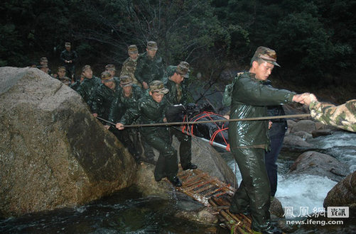 ????2010年12月13日凌晨2點37分,在安徽黃山景區(qū)因迷路被困的18名上海驢友在黃山景區(qū)一個未開發(fā)開放區(qū)域被當地搜救人員找到,不幸的是,50分鐘后,23歲的黃山風景區(qū)公安局民警張寧海在護送途中不幸墜崖身亡。圖為武警官兵護送張寧海的遺體。