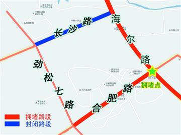 ????記者從現(xiàn)場(chǎng)指揮的交警處了解到,上周六海爾路與長(zhǎng)沙路開(kāi)始封閉施工,從海爾路進(jìn)出長(zhǎng)沙路必須從合肥路和勁松七路繞行,海爾路上的車流無(wú)法從長(zhǎng)沙路分流,造成合肥路口因?yàn)檐囕v太多大面積堵車。與此同時(shí),海爾路合肥路路口南北共計(jì)1公里路段封閉調(diào)流,車輛只能從原花壇處改造的較窄的調(diào)流車道通行,也造成了交通壓力?!皬膶挸ǖ?車道突然在這收緊變成兩車道,而且主道和輔道還不是對(duì)齊的,需要司機(jī)繞彎,這樣就造成了車流不暢?!爆F(xiàn)場(chǎng)交警告訴記者,上周六和上周日本來(lái)就已很堵了,昨天是路口封閉后首個(gè)工作日,這才會(huì)造成大堵車?!拔覀円呀?jīng)在媒體上發(fā)了道路封閉施工的公告,但很多司機(jī)沒(méi)注意,結(jié)果車在這個(gè)路口扎堆了?!苯痪f(shuō)。