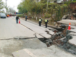 昨日上午11時(shí)37分許,省道103線108公里+200米處即涪(陵)豐(都)路南線涪陵清溪鎮(zhèn)境內(nèi),一段約70米長(zhǎng)的公路整體塌陷,斷口最深處達(dá)3米。兩輛私家車正好經(jīng)過此地,所幸并未滑入斷口。