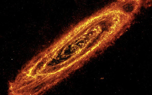 ????這個(gè)圖景在地球上是不可能看到的,因?yàn)樵谔罩邪l(fā)射的X射線與紅外線都被地球大氣層吸收了。但當(dāng)深夜最遠(yuǎn)星球可用肉眼觀測(cè)時(shí),人們是可以在正常光線下看到仙女座星系的。