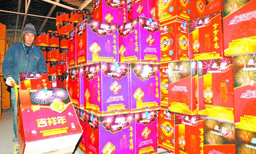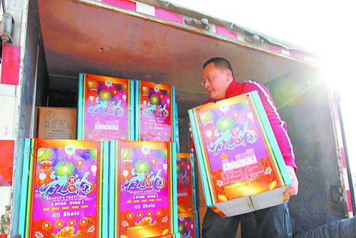 ????工作人員小心翼翼地將煙花爆竹搬上車。