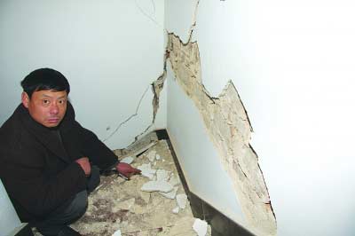 ????在余申龍的帶領(lǐng)下,記者心驚膽戰(zhàn)跟隨其走上2樓,上樓的樓梯間內(nèi)到處是墻面上被震落的水泥塊,而在一些外墻的拐角處,從脫落的粉刷層看到這些起到承重作用的墻面,有幾處磚面已經(jīng)發(fā)生錯(cuò)裂移位。走進(jìn)余申龍家2樓的房間,發(fā)現(xiàn)這里震后情況更嚴(yán)重,樓上一共3個(gè)房間,每一間房靠近東側(cè)的地板上都有一條貫通性的大裂縫,每一條裂縫都有兩三公分寬,10多厘米厚的地坪上本來(lái)鋪著硬度很高的地磚,這些地磚也都如同破布一樣被撕出了不規(guī)則的裂縫,裂開的縫隙塞進(jìn)一個(gè)手掌完全沒問題。后來(lái)余申龍自己也覺得呆在房?jī)?nèi)實(shí)在危險(xiǎn),便急匆匆?guī)ьI(lǐng)記者離開了這座危樓。