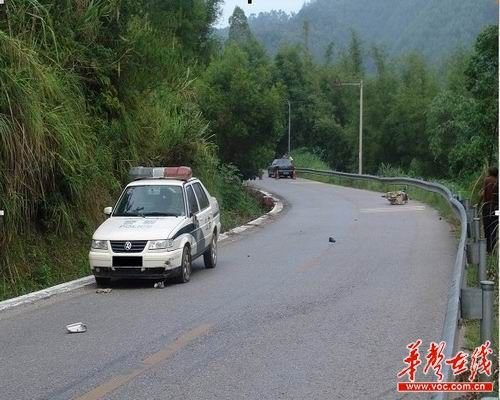 事故現(xiàn)場(chǎng)的照片顯示,事發(fā)地位于急轉(zhuǎn)彎坡地,警車(chē)??吭诘缆纷髠?cè),摩托車(chē)則倒在距離數(shù)十米的馬路右側(cè)。警車(chē)上沒(méi)有懸掛車(chē)牌,左前輪爆裂。