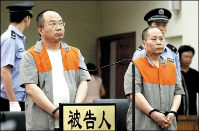 被告人董躍進(jìn)右、馬連龍?jiān)诜ㄍナ軐?。資料圖片 本報(bào)記者 歐陽(yáng)曉菲攝