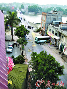 記者隨兩輛警車進入事故現(xiàn)場,在橋頭中段看見其中一段數(shù)米長的橋護欄被撞開;橋面上,稀稀拉拉地散落著摩托車油箱等零部件,一輛被肇事大貨車撞成了多截后起火燃燒的摩托車旁,以及與之相距七八米處的橋面上,先后倒臥著1具男性尸體和2具女尸,肢體均已殘缺不全;在橋頭的石角圩段,一輛中巴的車頭已被撞癟,車頭和車尾處也先后躺著三具殘缺不全的尸體;一輛滿載豬飼料的湖南牌肇事大貨車的車頭已深撞入路旁一幢樓高四層的嶄新居民樓房內,樓房的其中一個墻角被撞塌,路邊的一棵直徑有碗口粗的樹木被撞斷。