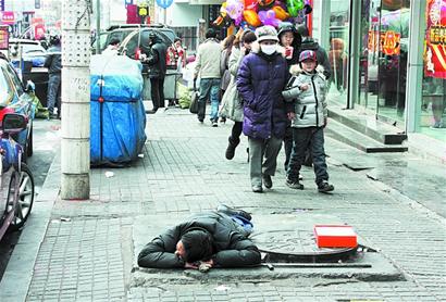 乞丐每日趴在路上睡 按時(shí)下班不在乎討多少錢(qián)