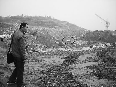 沐氏后人沐廣飛站在別墅工地,遠(yuǎn)處的省級文物保護(hù)單位沐英墓(圖中畫圈處)已經(jīng)陷入一片工地之中。記者 莊慶鴻攝圖片