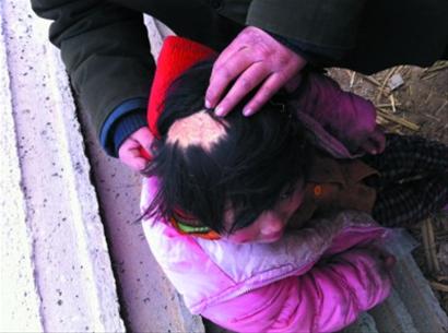 芳芳穿著一身破舊的棉衣,臉凍得生了瘡,頭發(fā)里露出兩塊慘白色的頭皮,耳朵、鼻子和舌頭也殘缺不全,十個(gè)指頭上都有傷疤。這些傷痕都是在被逼乞討時(shí),遭到“爸爸”(乞討兒童管“雜技團(tuán)”的老板叫“爸爸”)懲罰后留下的。
